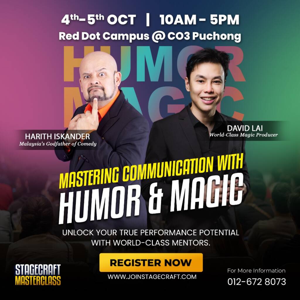 Whether you’re a trainer, speaker, entrepreneur, or simply someone who wants to be more engaging, this two-day, hands-on Masterclass at Red Dot Campus, CO3 Puchong (10 AM – 5 PM) is designed to give you practical tools you can use immediately. Expect an interactive, insightful, and transformational experience.